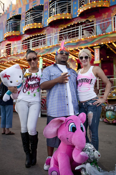 "Gorgeous", a pimp by profession enjoys a day at the Texas State Fair with his girls April on the left and Michelle on the right.