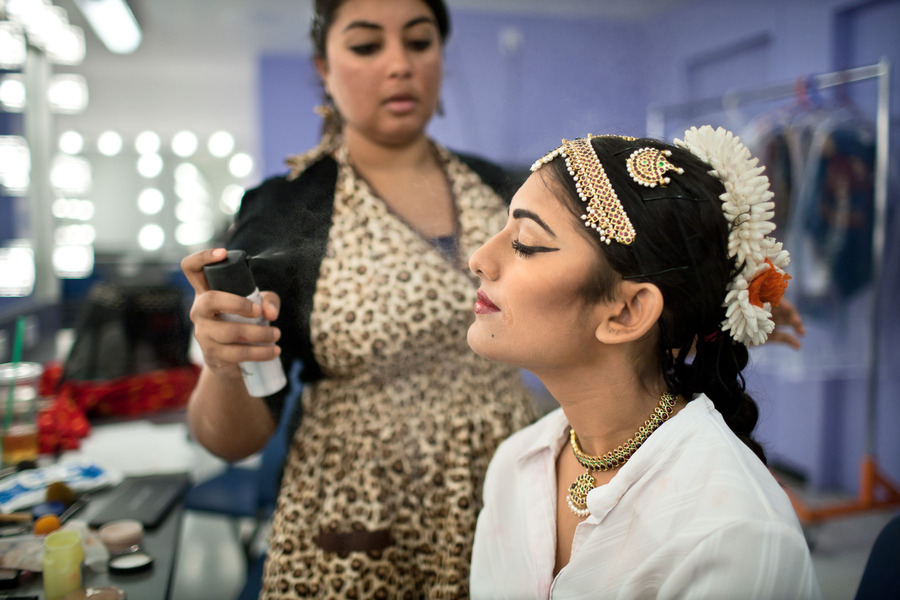 Suchitra Sundaram getting ready before her Bharatanatyam Arangetram at the Eisemann Center in Dallas, Texas.